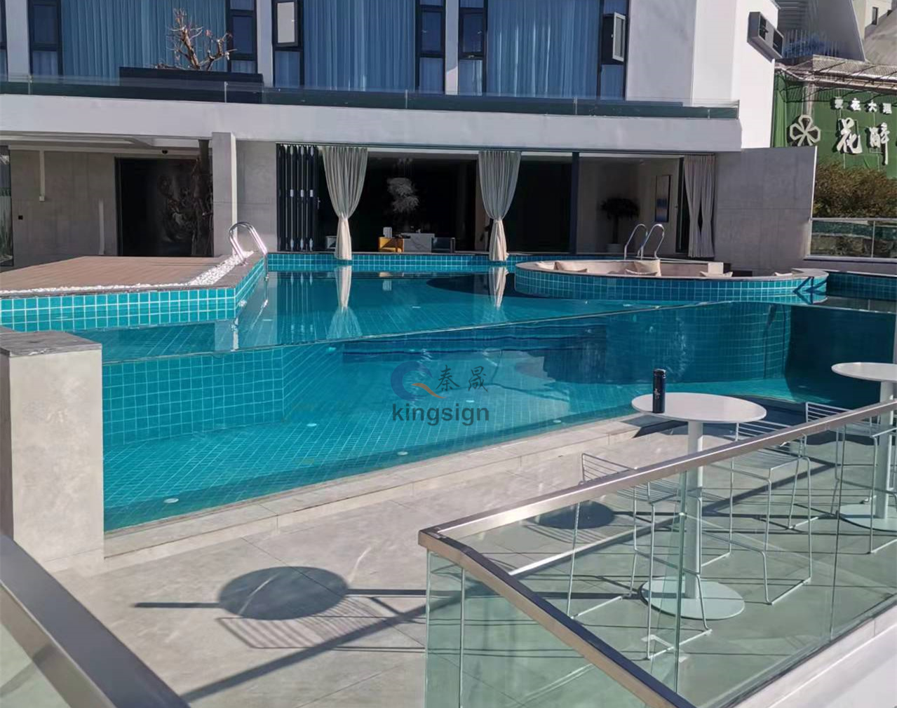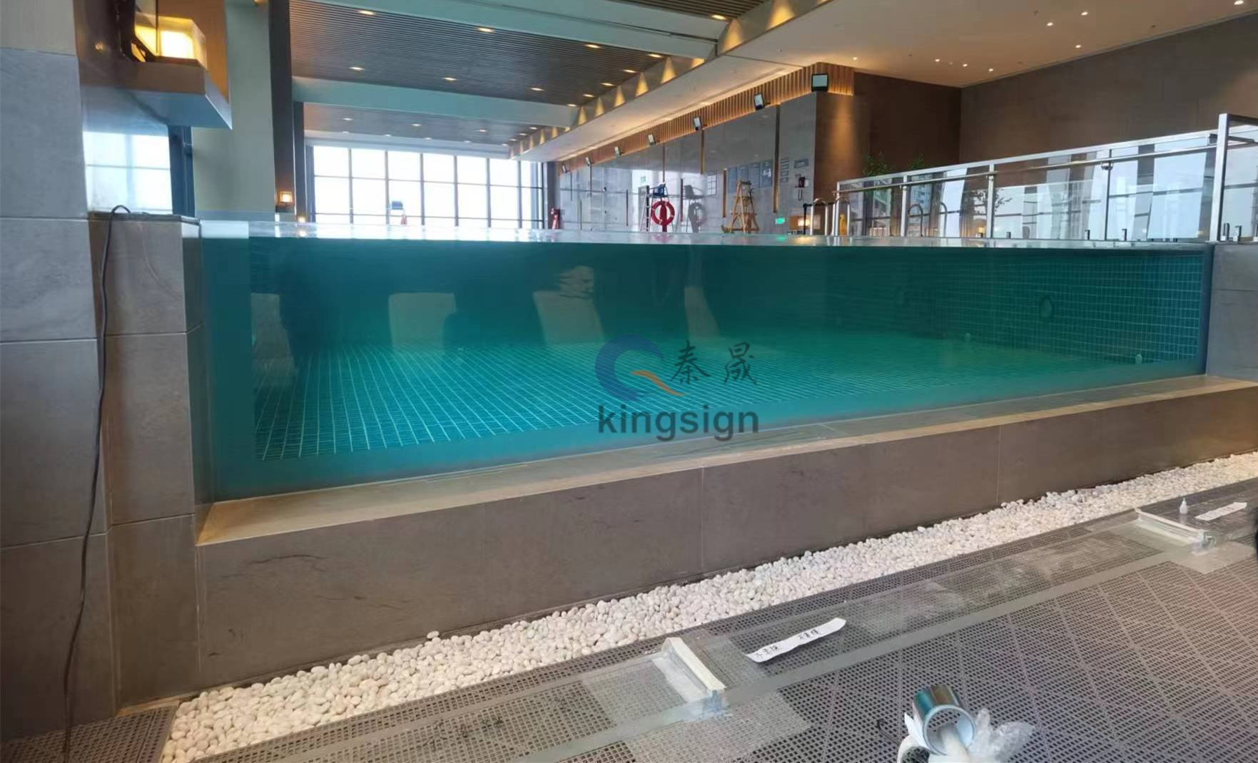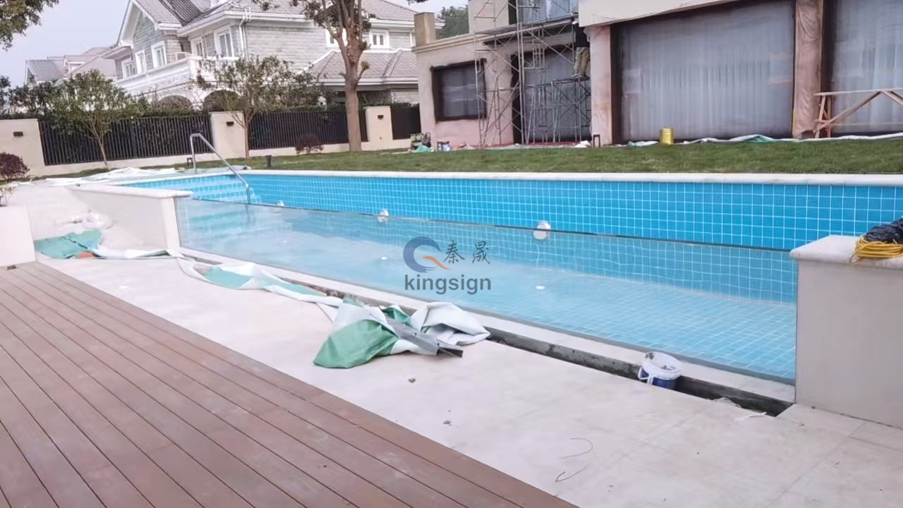 แผ่นอะคริลิคเป็นที่นิยมสำหรับหน้าต่างสระว่ายน้ำเนื่องจากมีการส่งผ่านแสงสูงและความต้านทานต่อแรงกระแทก อย่างไรก็ตามการสัมผัสกับน้ำแสงแดดและสารเคมีเป็นเวลานาน (คลอรีน, โบรมีน) สามารถทำให้เกิดการสะสมของพื้นผิวของขนาดการสะสมของแร่ธาตุสาหร่ายน้ำมันและสารเคมีที่ตกค้างซึ่งนำไปสู่สีเหลืองการซ้อมและความคมชัดลดลง